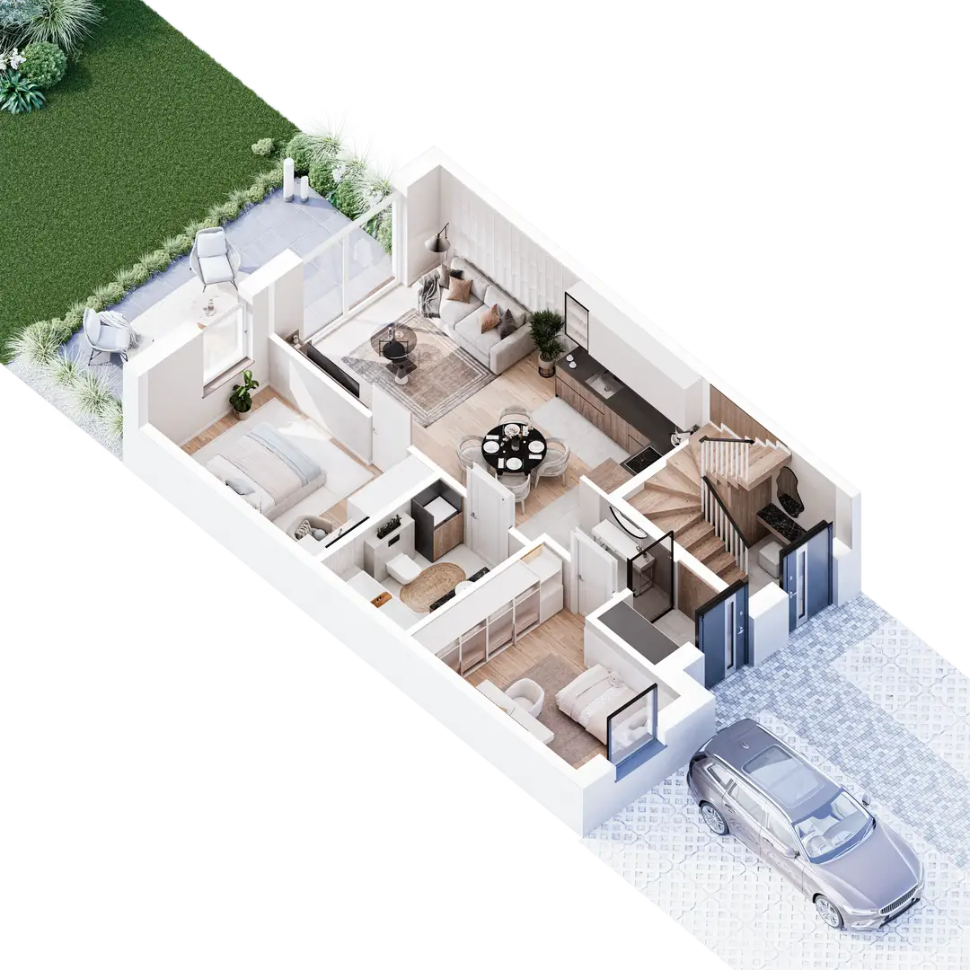 Każdy dzień możesz zacząć od chwili dla Siebie – w zielonym ogrodzie lub przestronnym tarasie. To miejsce na poranna herbatę w ciszy, czy letnie wieczory z bliskimi. Może właśnie w ogrodzie na miękkiej trawie pierwsze kroki postawi malutki człowiek. To Twoja prywatna przestrzeń pod gołym niebem z gwiazdami. Tutaj każda chwila spędzona razem zostanie na lata w pamięci!